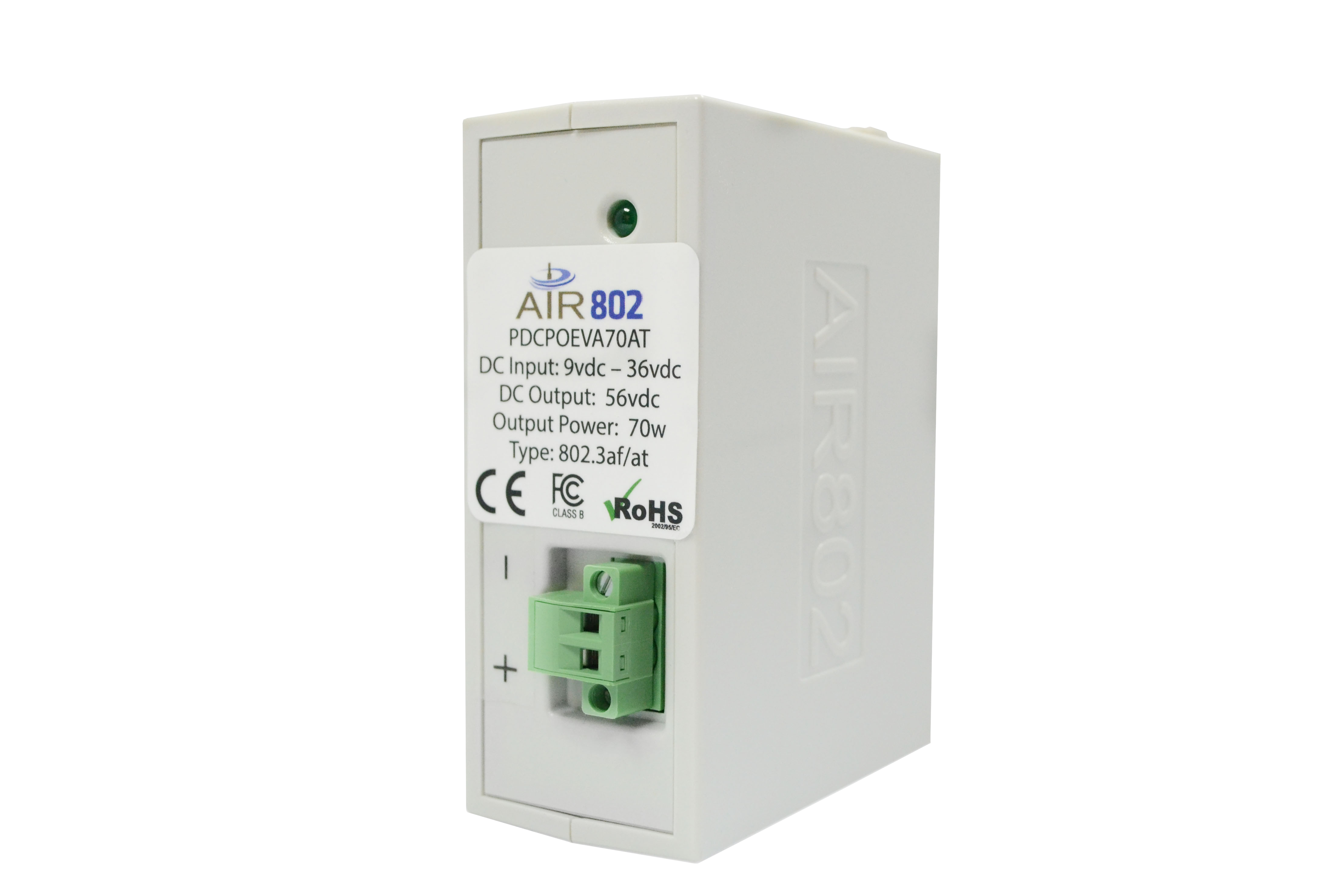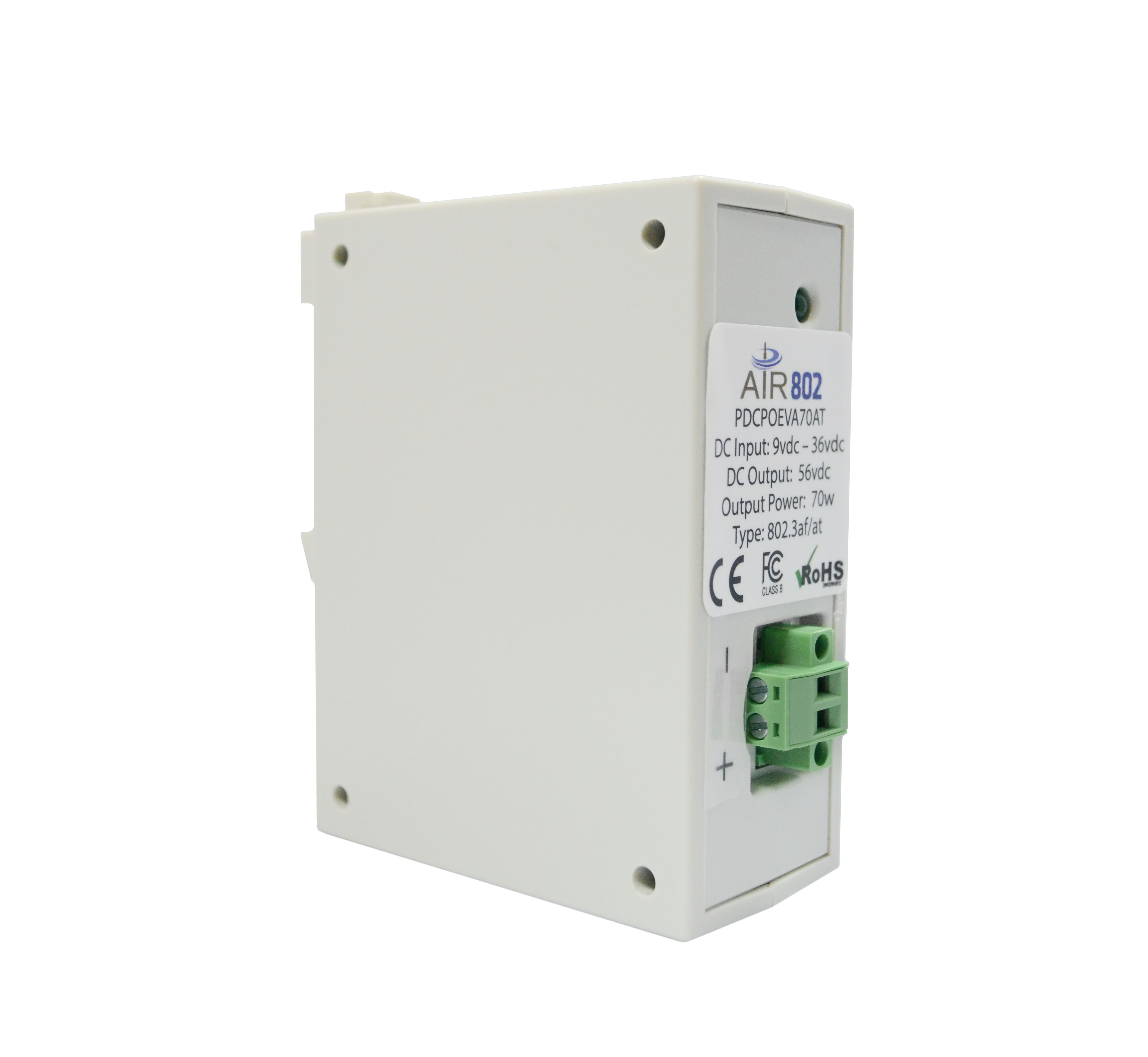 Conversor de DC a DC con salida de alimentacióna través de Ethernet (PoE). Uso en aplicaciones donde existe una entrada de voltaje entre 9 y 36 vdc y el equipo que se está instalando requiere IEEE 802.3af o 802.3at con 56 vdc y hasta 70 vatios o 90 vatios (con 24vdc) entrada de poder. Este modelo está diseñado para montaje en riel DIN.