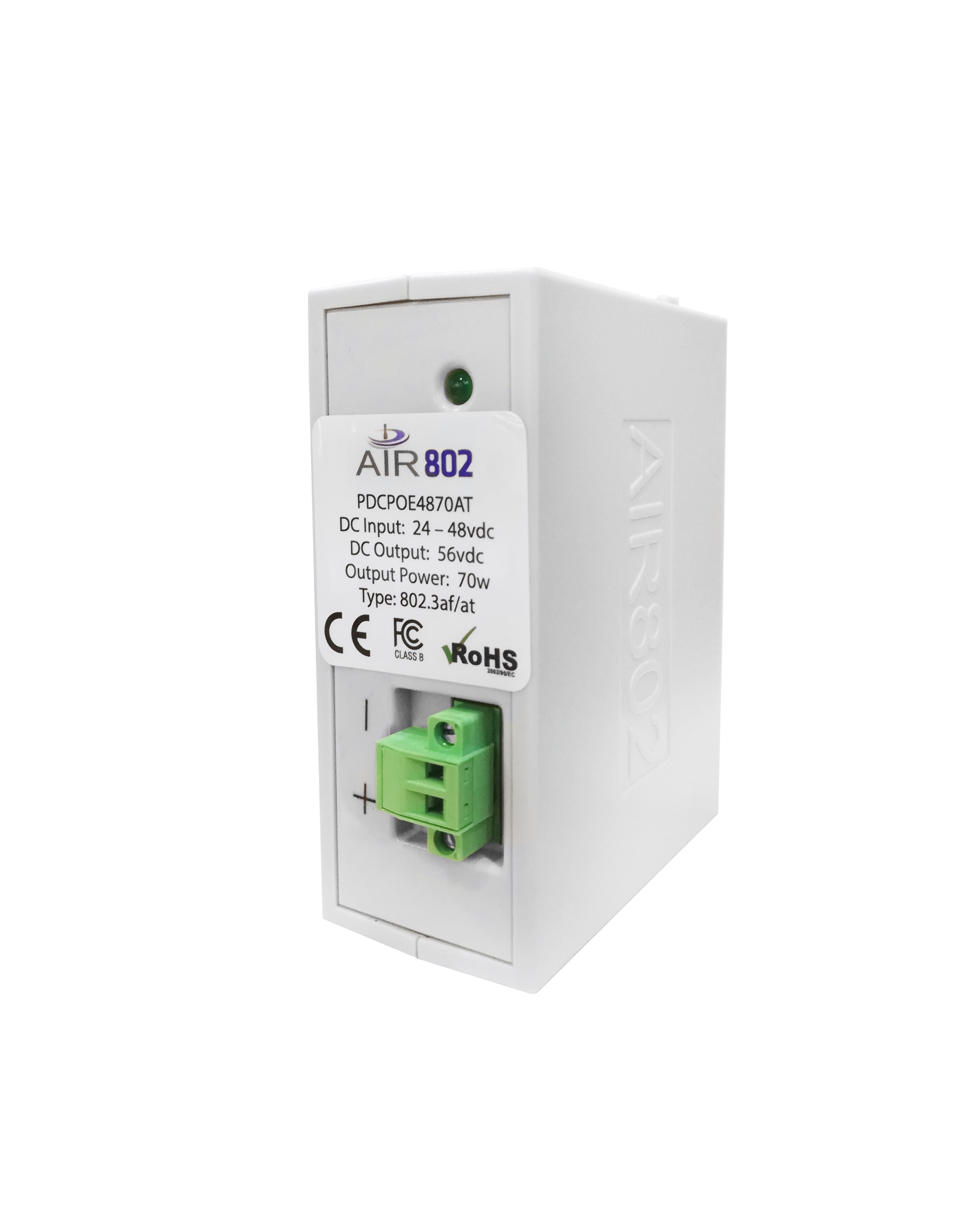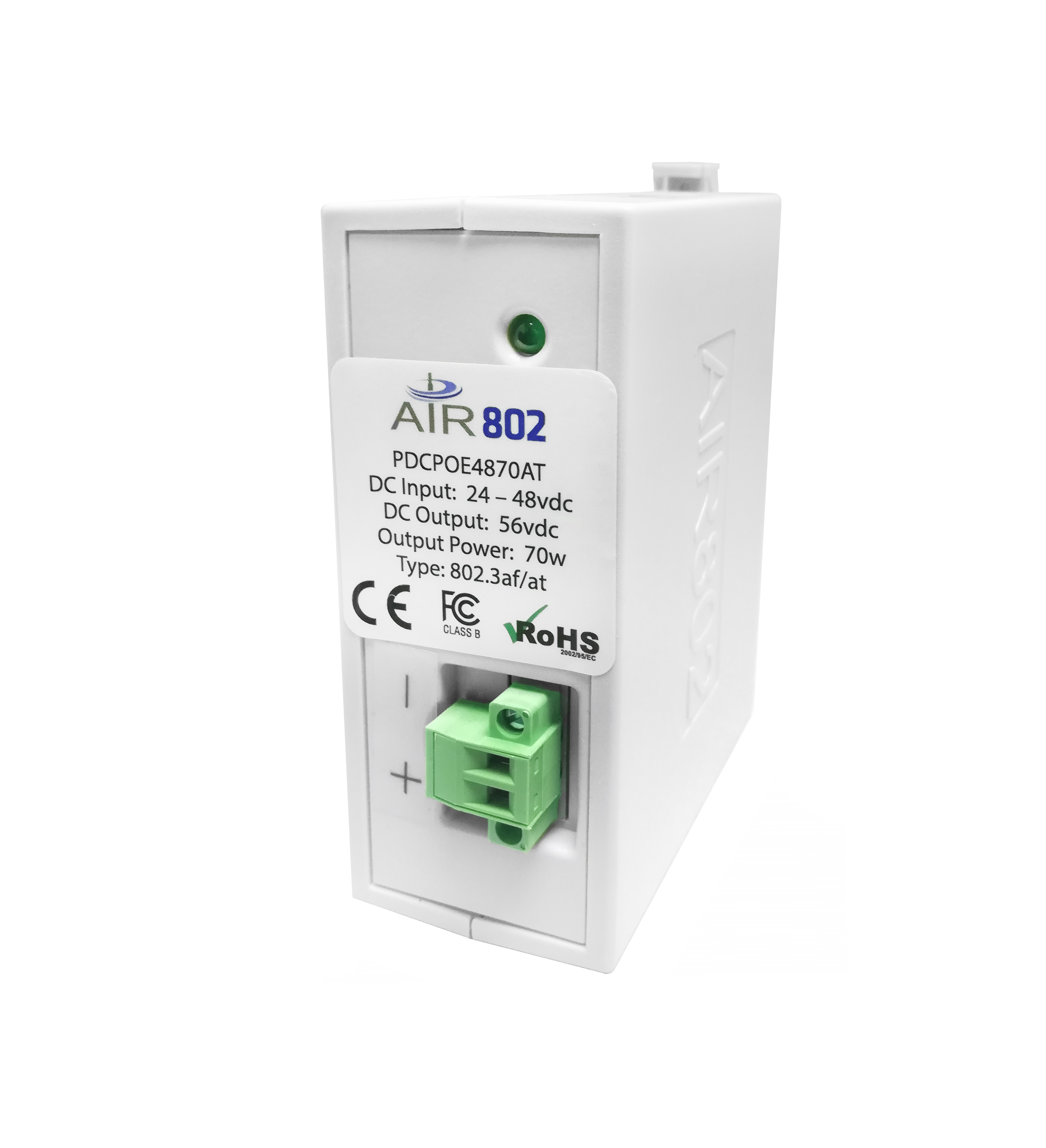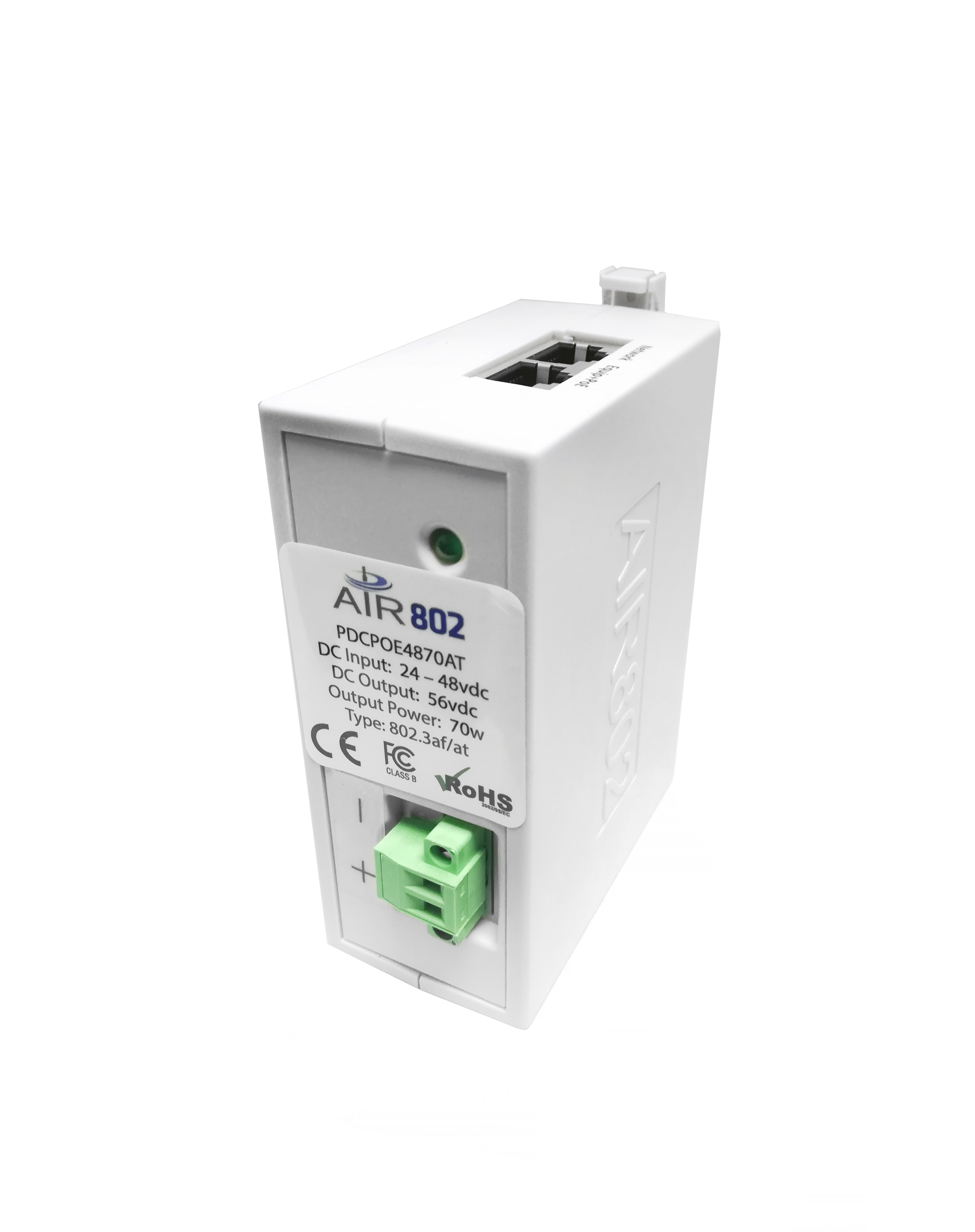 El modelo PDCPOE4870AT es un convertidor de DC a DC con salida de alimentación a través de Ethernet (PoE). Este producto fue diseñado y fabricado en los EE. UU. Por AIR802 para su uso en aplicaciones donde existe una entrada de voltaje de 24 a 48 vcc y el equipo que se está instalando requiere IEEE 802.3af u 802.3at con 56 vcc y 70 a 90 vatios. Este modelo está diseñado para montaje en riel DIN. AIR802 ofrece secciones cortas de montaje en riel DIN para nuestros clientes.